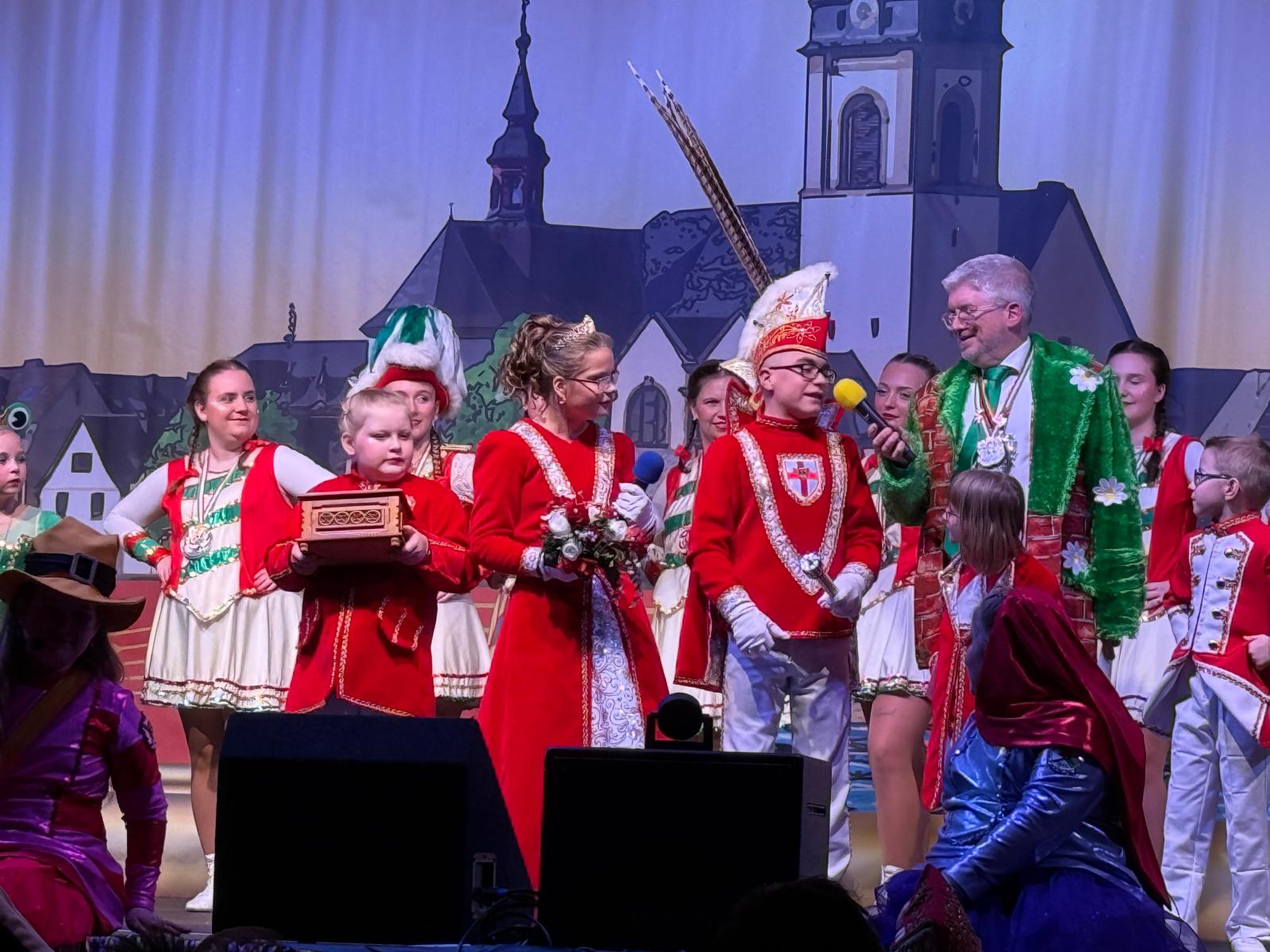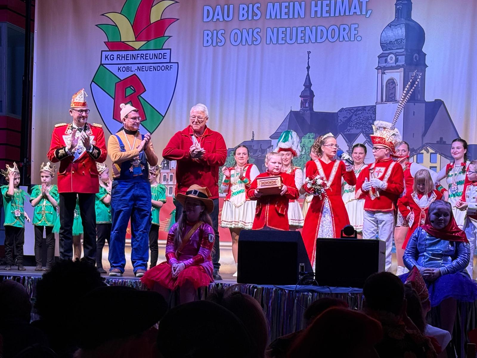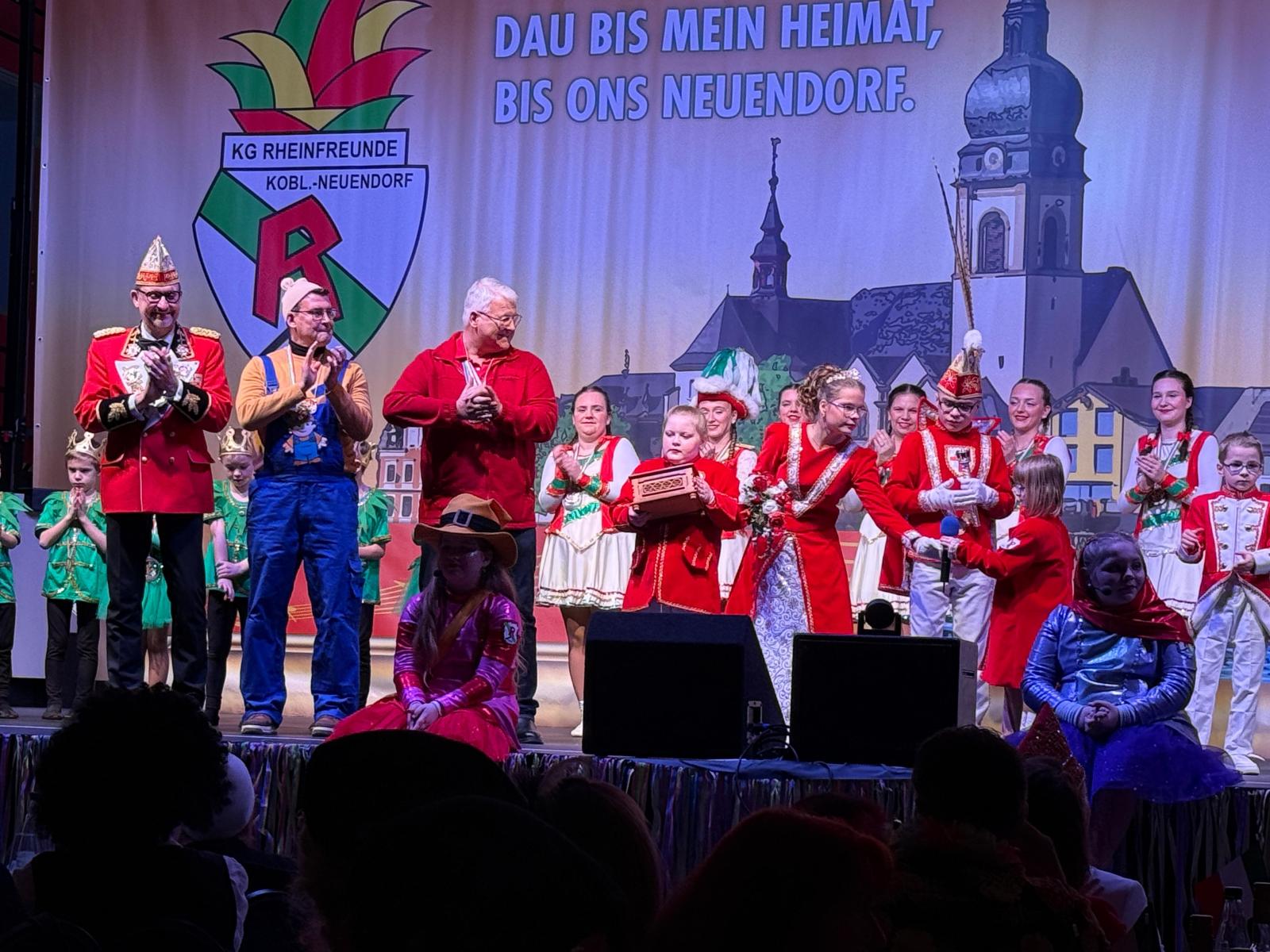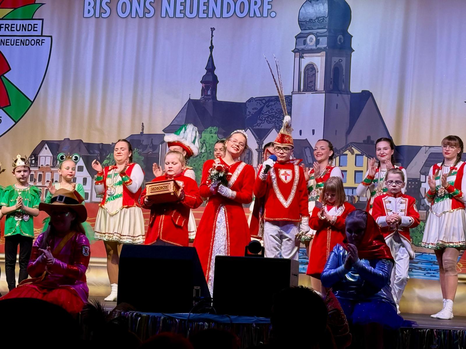 Ein weiteres Highlight des Abends war der Auftritt des Kinderprinzenpaares Prinz Momo und Prinzessin Stella aus den eigenen Reihen. Die jungen Tollitäten wurden gebührend gefeiert und ließen sich von ihrem Publikum ordentlich hochleben. Auch Prinz Oli und Confluentia Ricarda von den Kapuzemännern aus Kesselheim waren mit ihrem Gefolge zu Gast. Souverän beantworteten sie Fragen rund um Neuendorf und wurden mit süßen Überraschungen belohnt.