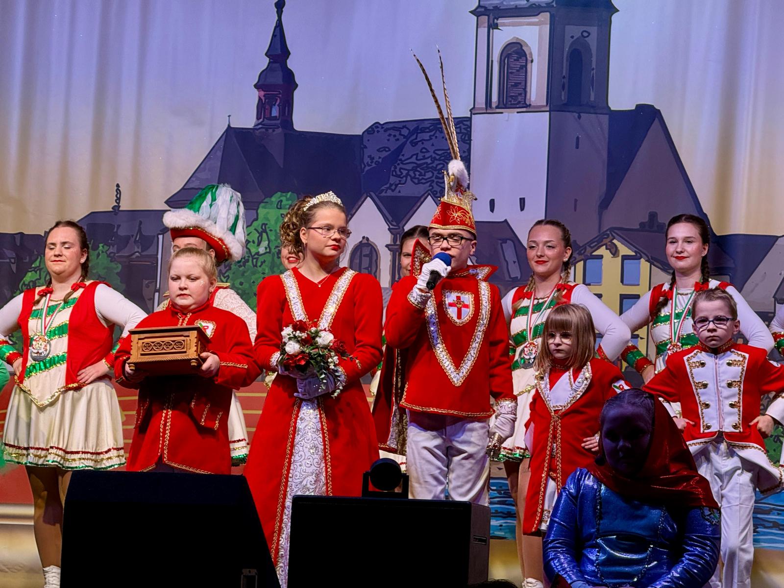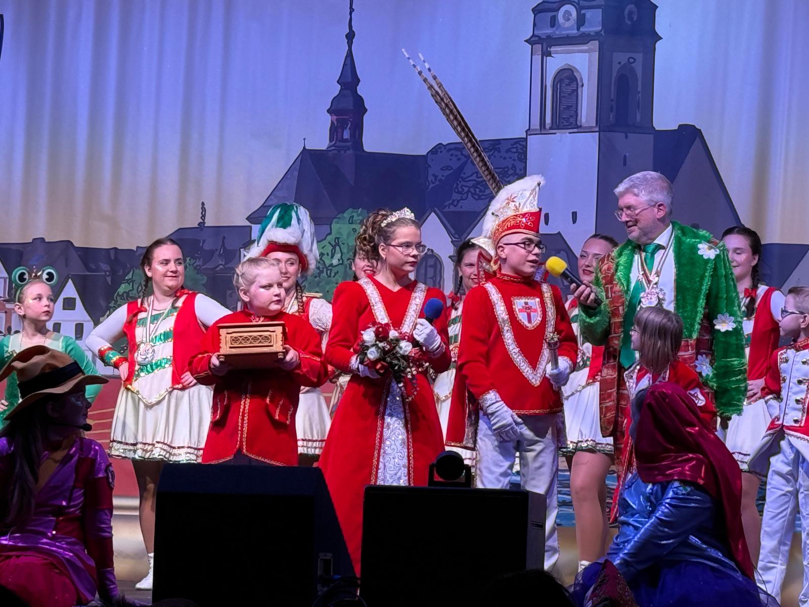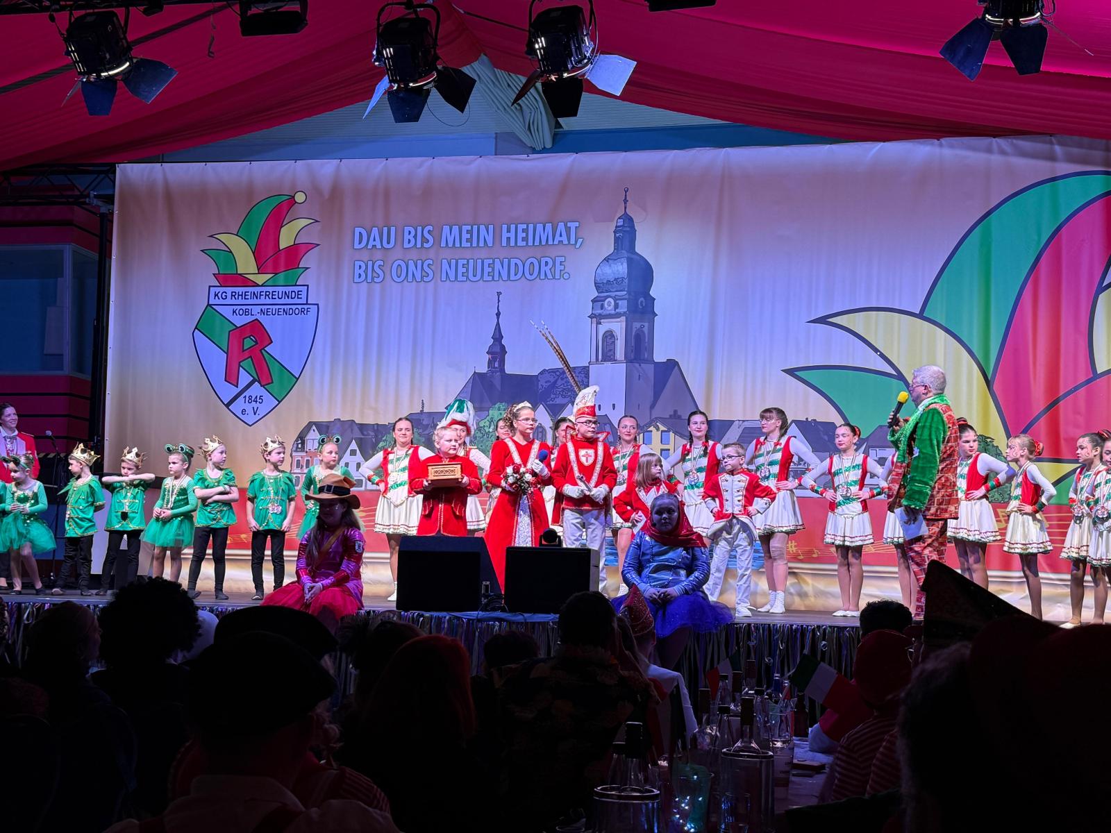 Ein weiteres Highlight des Abends war der Auftritt des Kinderprinzenpaares Prinz Momo und Prinzessin Stella aus den eigenen Reihen. Die jungen Tollitäten wurden gebührend gefeiert und ließen sich von ihrem Publikum ordentlich hochleben. Auch Prinz Oli und Confluentia Ricarda von den Kapuzemännern aus Kesselheim waren mit ihrem Gefolge zu Gast. Souverän beantworteten sie Fragen rund um Neuendorf und wurden mit süßen Überraschungen belohnt.