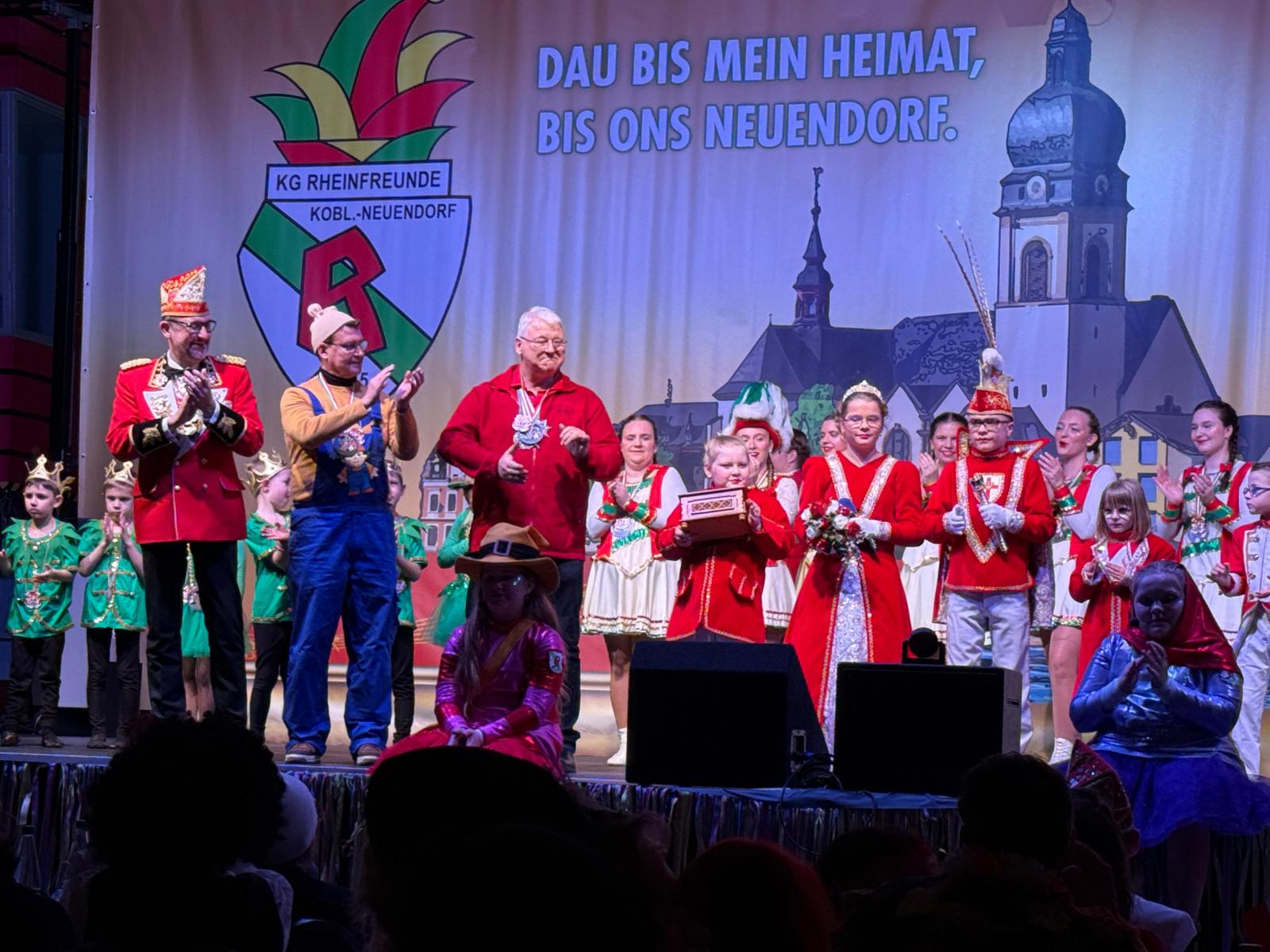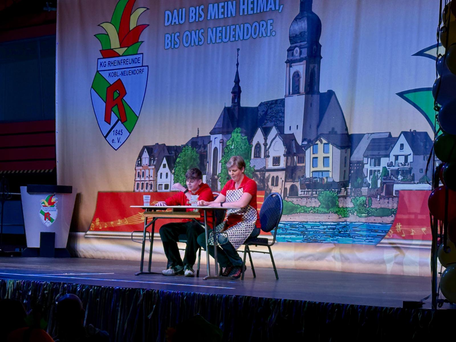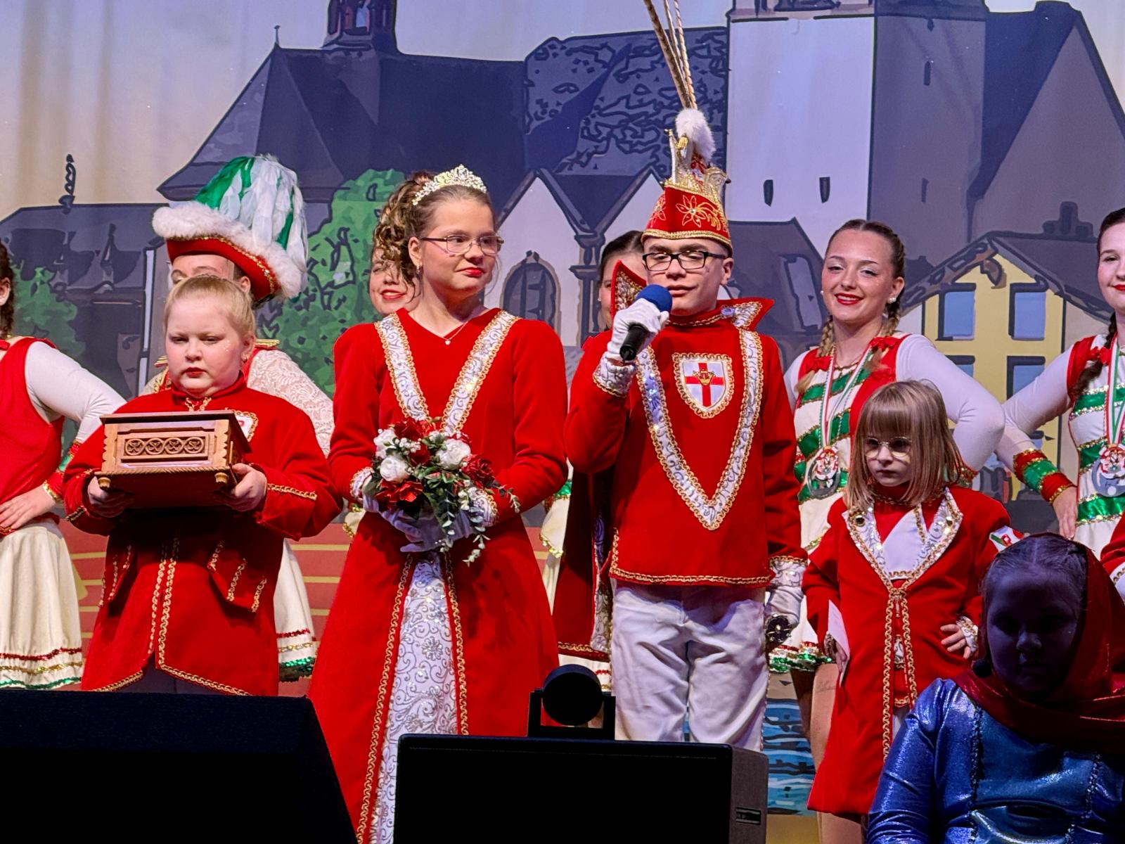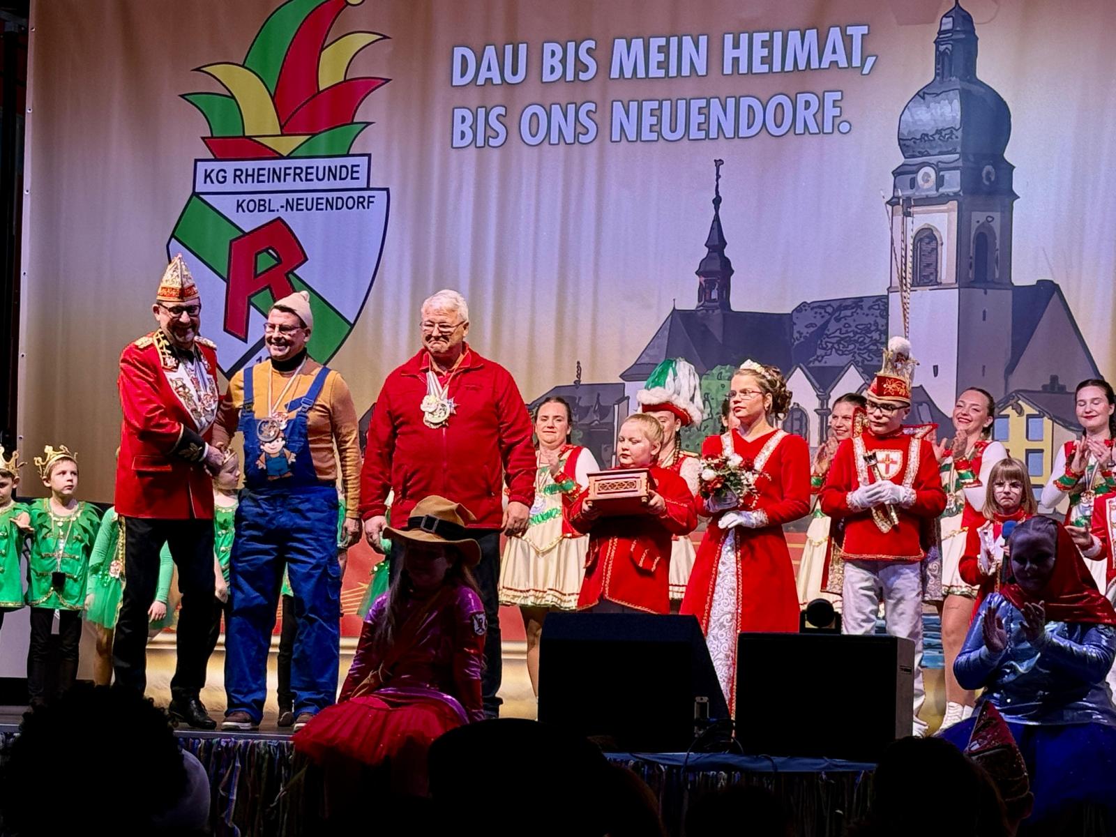 Ein weiteres Highlight des Abends war der Auftritt des Kinderprinzenpaares Prinz Momo und Prinzessin Stella aus den eigenen Reihen. Die jungen Tollitäten wurden gebührend gefeiert und ließen sich von ihrem Publikum ordentlich hochleben. Auch Prinz Oli und Confluentia Ricarda von den Kapuzemännern aus Kesselheim waren mit ihrem Gefolge zu Gast. Souverän beantworteten sie Fragen rund um Neuendorf und wurden mit süßen Überraschungen belohnt.