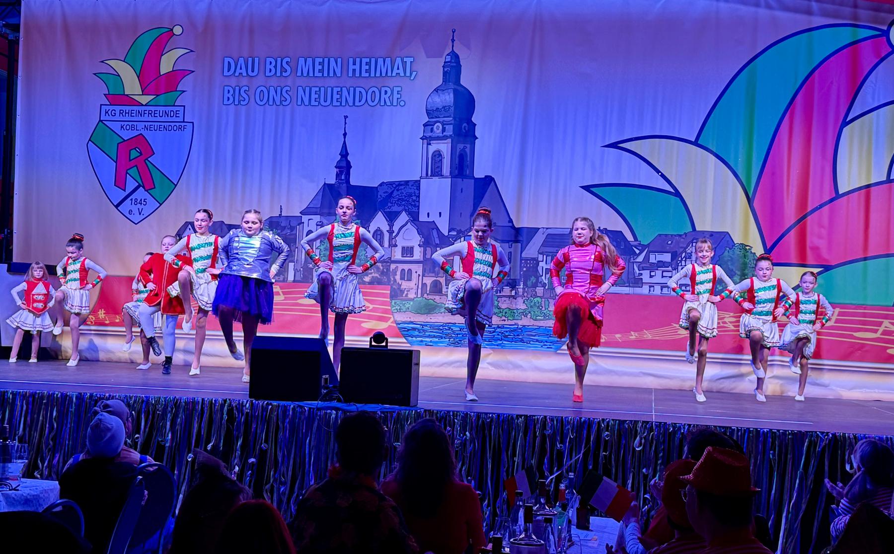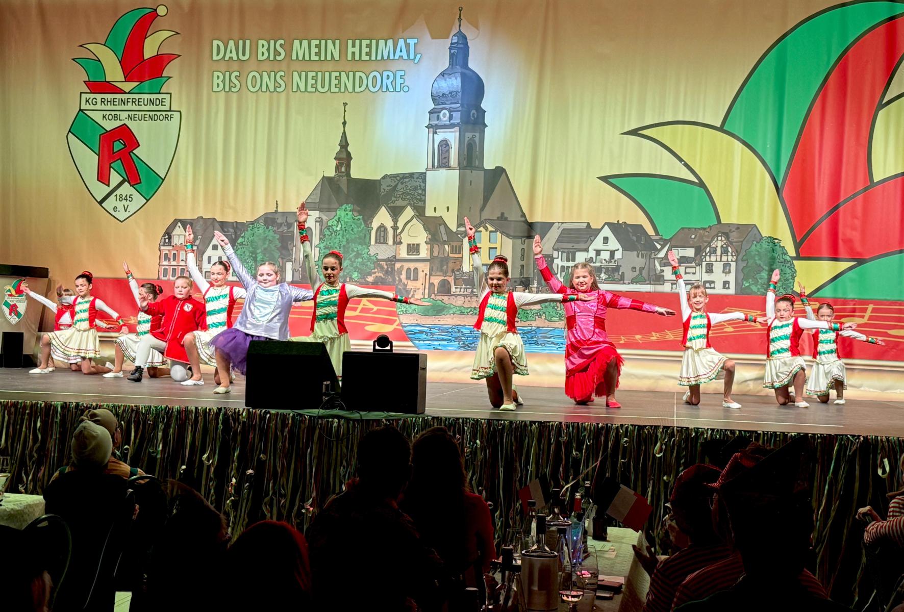 Für weitere Glanzlichter sorgten die Showtanzgruppen des Abends: die Tänzer und Tänzerinnen des Narren-Clubs Waschem, die Funny Girls & Boys der Fidele Mädcher Wallersheim sowie die „Stammgäste“ der Grün-Weißen Funken vom Zippchen aus Kölsch-Büllesbach brachten die Bühne zum Beben. Auch die Funkemariechen Charlotte und Paula Nungesser aus Wetzlar stimmten das Publikum auf die närrische Zeit ein. Besonders hervorzuheben ist der erstmalige Auftritt der Showtanzgruppe der KuK Rübenach auf der Rheinfreunde-Bühne, die das Publikum in eine Welt voller Träume entführte.