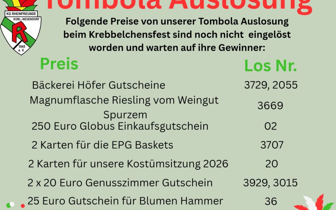 Die Gewinnerlose wurden am Sonntag gezogen 🎟️🥳. Falls eure Losnummer unter den gezogenen Gewinnen ist und ihr bei der Auslosung nicht dabei sein konntet, meldet euch bitte bis spätestens 30.10.2025 an veranstaltung@kg-rheinfreunde.de.